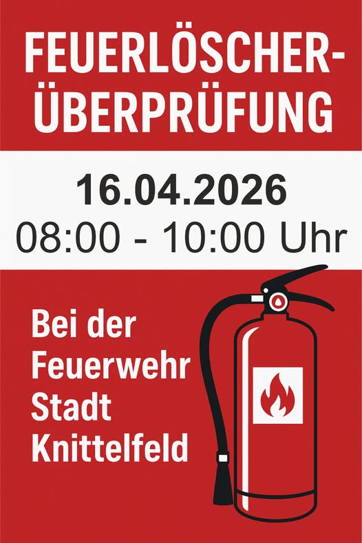 Am 16. April 2026 besteht zwischen 08:00 Uhr und 10:00 Uhr die Möglichkeit, Ihre Feuerlöscher bei der Stadtfeuerwehr Knittelfeld überprüfen zu lassen. Die Abgabe ist bereits am Vorabend von 17:45 Uhr