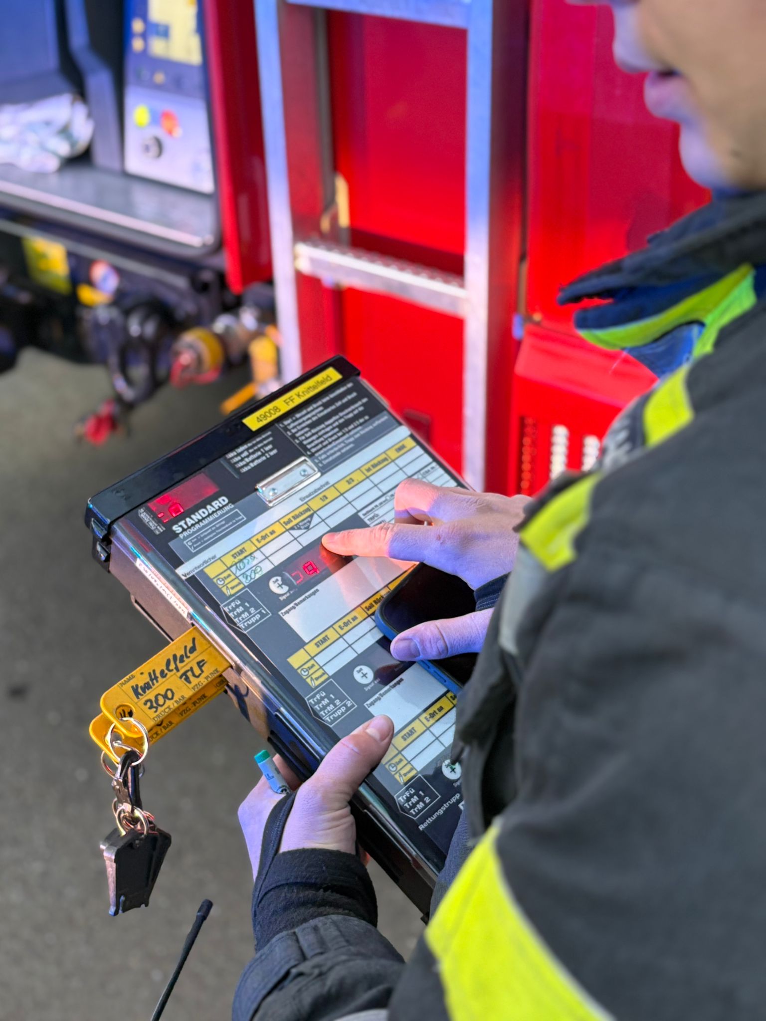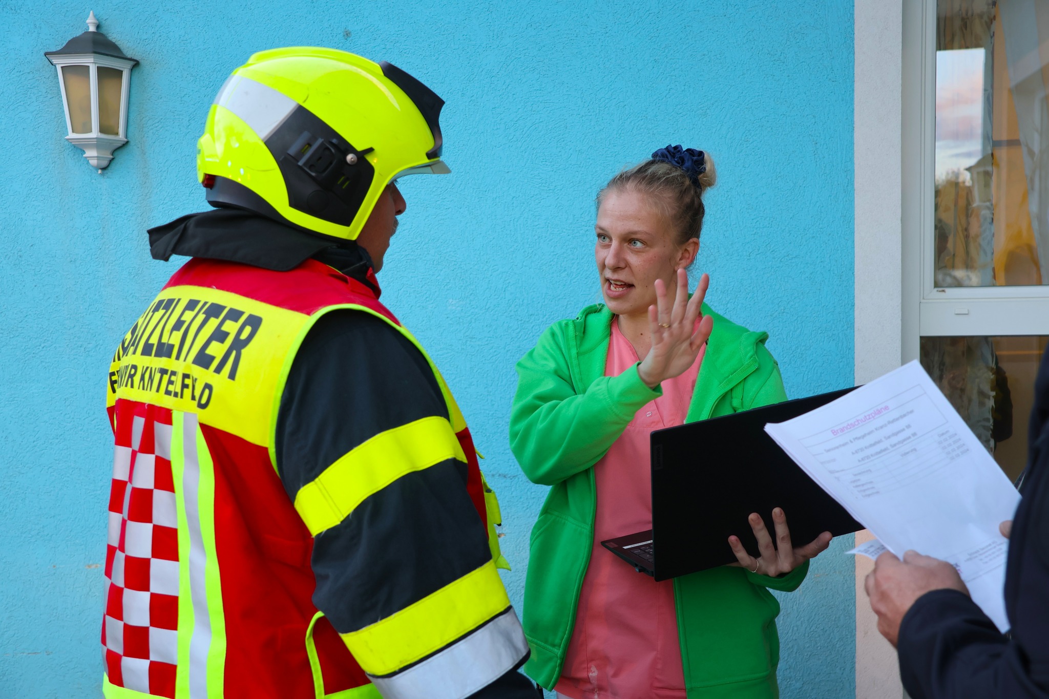 Bereits auf der Anfahrt rüsteten sich die Atemschutzträger aus, um beim Eintreffen sofort eingreifen zu können. Eine Pflegekraft des Hauses empfing den Übungseinsatzleiter und übergab wichtige Informationen zur Lage.